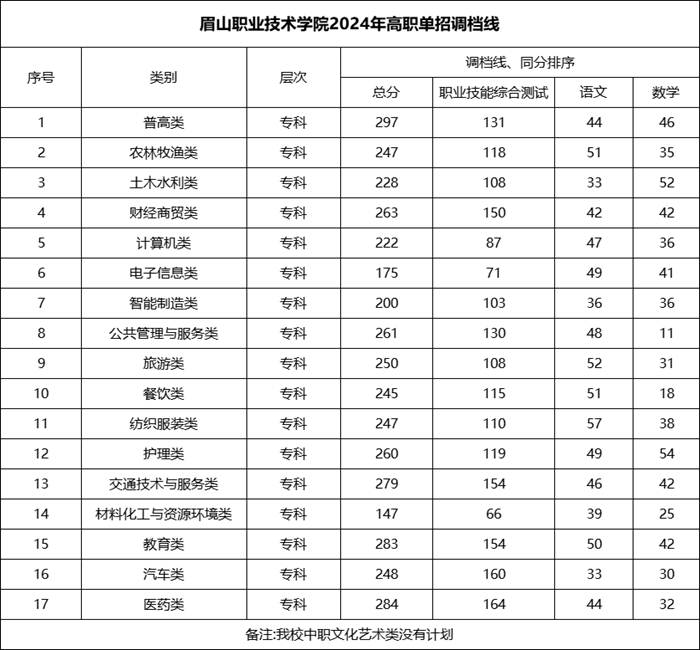 眉山職業(yè)技術(shù)學(xué)院2024年高職單招各專業(yè)類調(diào)檔線