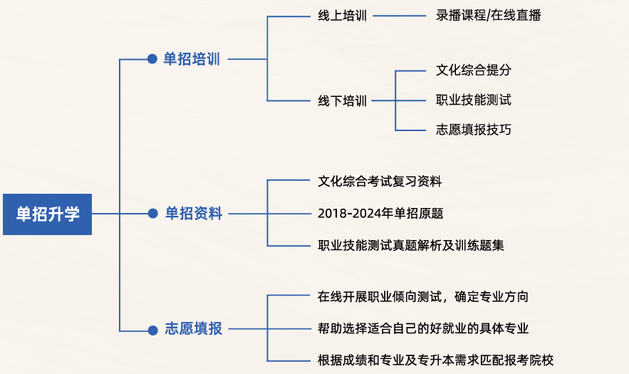 名校沖刺協(xié)議班:針對國家示范、國家骨干、省級示范院校的沖刺,內容包括單招文化全科、綜合素質面試/筆試(或通識技術)和志愿填報指導。