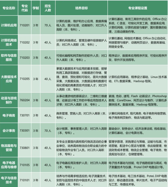 學(xué)校開設(shè)有數(shù)控技術(shù)應(yīng)用、建筑工程施工、工程測量、幼兒保育、計算機(jī)應(yīng)用、計算機(jī)網(wǎng)絡(luò)技術(shù)、軟件與信息服務(wù)、動漫與游戲制作、電子商務(wù)、會計事務(wù)、電子電器應(yīng)用與維修、電子與信息技術(shù)、物流服務(wù)與管理、高星級飯店運營與管理、裝配式建筑施工、大數(shù)據(jù)技術(shù)應(yīng)用、數(shù)字媒體技術(shù)應(yīng)用、工業(yè)機(jī)器人技術(shù)應(yīng)用,電商直播等20個專業(yè)。與市內(nèi)多所高校聯(lián)合招收3+2分段制學(xué)生。
